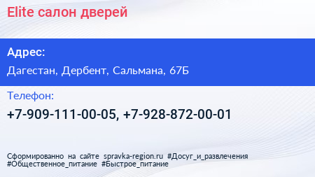Elite, салон дверей по адресу Дагестан, Дербент, Сальмана, 67Б в дальнейшем Организация, размещена в следующих категориях: