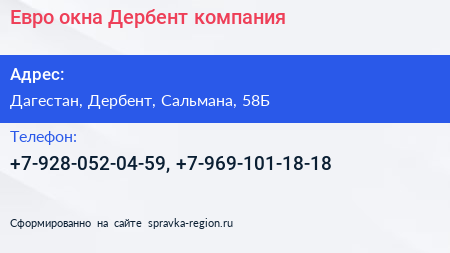 Евро окна Дербент, компания по адресу Дагестан, Дербент, Сальмана, 58Б в дальнейшем Организация, размещена в следующих категориях: