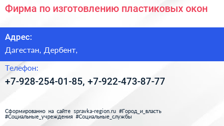 Фирма по изготовлению пластиковых окон по адресу Дагестан, Дербент, в дальнейшем Организация, размещена в следующих категориях: