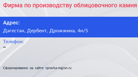 Фирма по производству облицовочного камня по адресу Дагестан, Дербент, Дрожжина, 4н/5 в дальнейшем Организация, размещена в следующих категориях: