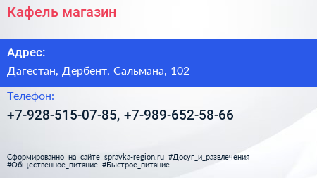 Кафель, магазин по адресу Дагестан, Дербент, Сальмана, 102 в дальнейшем Организация, размещена в следующих категориях:
