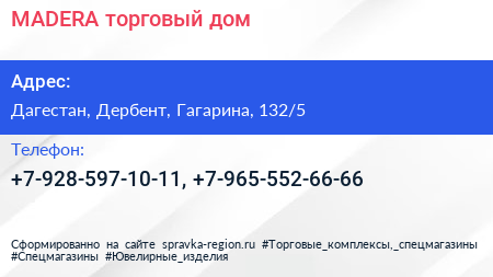 MADERA, торговый дом по адресу Дагестан, Дербент, Гагарина, 132/5 в дальнейшем Организация, размещена в следующих категориях: