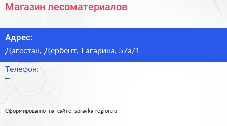 Магазин лесоматериалов по адресу Дагестан, Дербент, Гагарина, 57а/1 в дальнейшем Организация, размещена в следующих категориях: