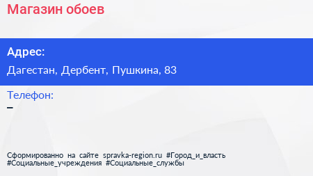 Магазин обоев по адресу Дагестан, Дербент, Пушкина, 83 в дальнейшем Организация, размещена в следующих категориях: