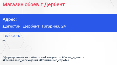 Магазин обоев, г. Дербент по адресу Дагестан, Дербент, Гагарина, 24 в дальнейшем Организация, размещена в следующих категориях: