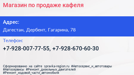 Магазин по продаже кафеля по адресу Дагестан, Дербент, Гагарина, 78 в дальнейшем Организация, размещена в следующих категориях: