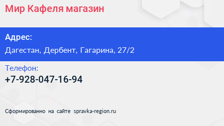 Мир Кафеля, магазин по адресу Дагестан, Дербент, Гагарина, 27/2 в дальнейшем Организация, размещена в следующих категориях: