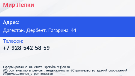 Мир Лепки по адресу Дагестан, Дербент, Гагарина, 44 в дальнейшем Организация, размещена в следующих категориях: