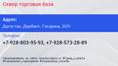 Север, торговая база по адресу Дагестан, Дербент, Гагарина, 107г в дальнейшем Организация, размещена в следующих категориях: