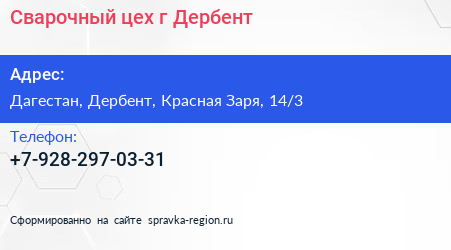 Сварочный цех, г. Дербент по адресу Дагестан, Дербент, Красная Заря, 14/3 в дальнейшем Организация, размещена в следующих категориях: