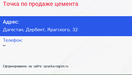 Точка по продаже цемента по адресу Дагестан, Дербент, Ярагского, 32 в дальнейшем Организация, размещена в следующих категориях: