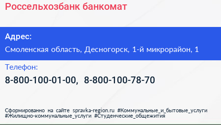 Россельхозбанк, банкомат по адресу Смоленская область, Десногорск, 1-й микрорайон, 1 в дальнейшем Организация, размещена в следующих категориях: