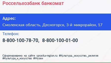 Россельхозбанк, банкомат по адресу Смоленская область, Десногорск, 3-й микрорайон, 17 в дальнейшем Организация, размещена в следующих категориях: