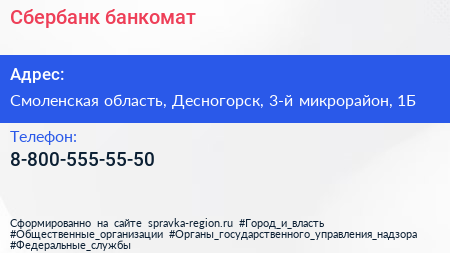Сбербанк, банкомат по адресу Смоленская область, Десногорск, 3-й микрорайон, 1Б в дальнейшем Организация, размещена в следующих категориях: