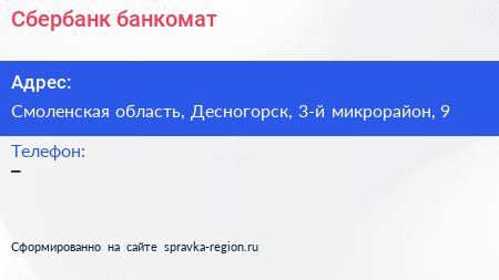 Сбербанк, банкомат по адресу Смоленская область, Десногорск, 3-й микрорайон, 9 в дальнейшем Организация, размещена в следующих категориях:
