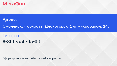 МегаФон по адресу Смоленская область, Десногорск, 1-й микрорайон, 14а в дальнейшем Организация, размещена в следующих категориях: