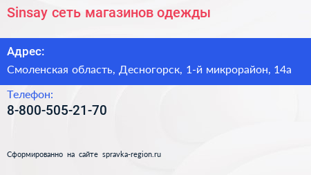 Sinsay, сеть магазинов одежды по адресу Смоленская область, Десногорск, 1-й микрорайон, 14а в дальнейшем Организация, размещена в следующих категориях: