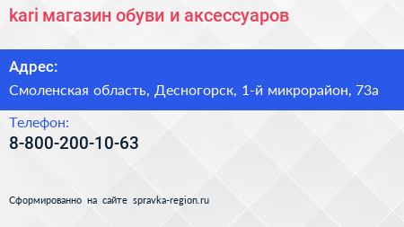 kari, магазин обуви и аксессуаров по адресу Смоленская область, Десногорск, 1-й микрорайон, 73а в дальнейшем Организация, размещена в следующих категориях: