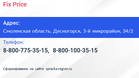 Fix Price по адресу Смоленская область, Десногорск, 3-й микрорайон, 34/2 в дальнейшем Организация, размещена в следующих категориях: