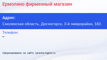 Ермолино, фирменный магазин по адресу Смоленская область, Десногорск, 3-й микрорайон, 183 в дальнейшем Организация, размещена в следующих категориях: