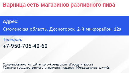 Варница, сеть магазинов разливного пива по адресу Смоленская область, Десногорск, 2-й микрорайон, 12а в дальнейшем Организация, размещена в следующих категориях: