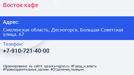 Восток, кафе по адресу Смоленская область, Десногорск, Большая Советская улица, 67 в дальнейшем Организация, размещена в следующих категориях:
