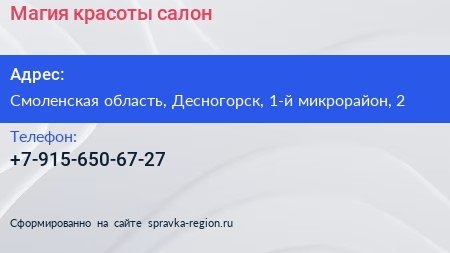 Магия красоты, салон по адресу Смоленская область, Десногорск, 1-й микрорайон, 2 в дальнейшем Организация, размещена в следующих категориях: