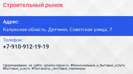 Строительный рынок по адресу Калужская область, Детчино, Советская улица, 7 в дальнейшем Организация, размещена в следующих категориях: