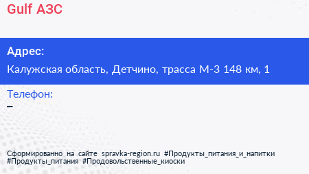 Gulf, АЗС по адресу Калужская область, Детчино, трасса М-3 148 км, 1 в дальнейшем Организация, размещена в следующих категориях: