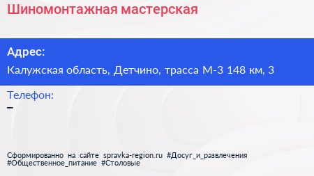 Шиномонтажная мастерская по адресу Калужская область, Детчино, трасса М-3 148 км, 3 в дальнейшем Организация, размещена в следующих категориях: