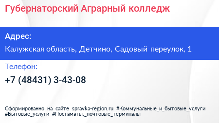 Губернаторский Аграрный колледж по адресу Калужская область, Детчино, Садовый переулок, 1 в дальнейшем Организация, размещена в следующих категориях: