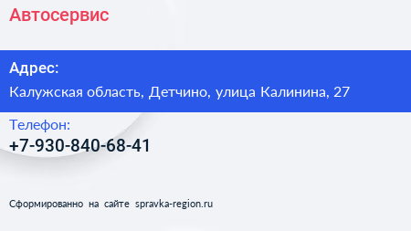 Автосервис+ по адресу Калужская область, Детчино, улица Калинина, 27 в дальнейшем Организация, размещена в следующих категориях: