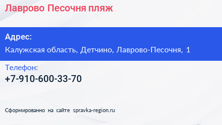 Лаврово-Песочня, пляж по адресу Калужская область, Детчино, Лаврово-Песочня, 1 в дальнейшем Организация, размещена в следующих категориях: