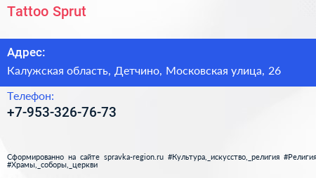 Tattoo Sprut по адресу Калужская область, Детчино, Московская улица, 26 в дальнейшем Организация, размещена в следующих категориях: