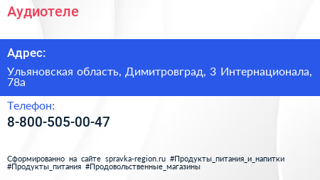 Аудиотеле по адресу Ульяновская область, Димитровград, 3 Интернационала, 78а в дальнейшем Организация, размещена в следующих категориях: