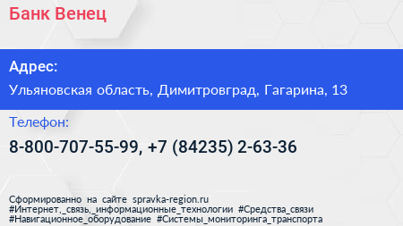 Банк Венец по адресу Ульяновская область, Димитровград, Гагарина, 13 в дальнейшем Организация, размещена в следующих категориях: