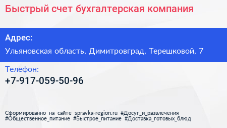 Быстрый счет, бухгалтерская компания по адресу Ульяновская область, Димитровград, Терешковой, 7 в дальнейшем Организация, размещена в следующих категориях: