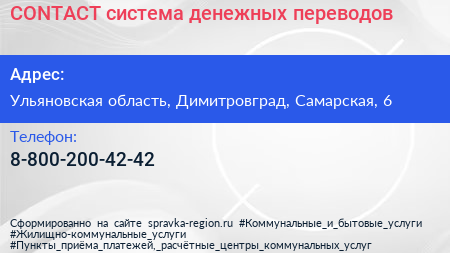 CONTACT, система денежных переводов по адресу Ульяновская область, Димитровград, Самарская, 6 в дальнейшем Организация, размещена в следующих категориях: