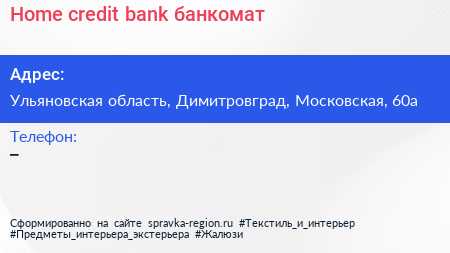 Home credit bank, банкомат по адресу Ульяновская область, Димитровград, Московская, 60а в дальнейшем Организация, размещена в следующих категориях: