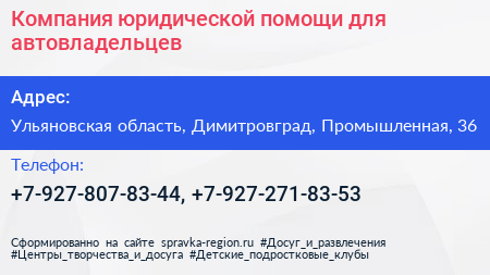Компания юридической помощи для автовладельцев по адресу Ульяновская область, Димитровград, Промышленная, 36 в дальнейшем Организация, размещена в следующих категориях: