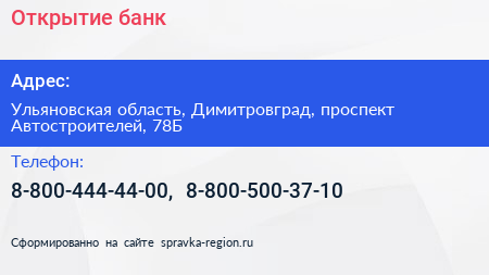 Открытие, банк по адресу Ульяновская область, Димитровград, проспект Автостроителей, 78Б в дальнейшем Организация, размещена в следующих категориях: