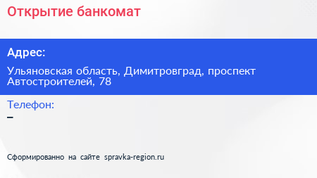 Открытие, банкомат по адресу Ульяновская область, Димитровград, проспект Автостроителей, 78 в дальнейшем Организация, размещена в следующих категориях: