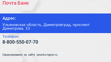 Почта Банк по адресу Ульяновская область, Димитровград, проспект Димитрова, 13 в дальнейшем Организация, размещена в следующих категориях: