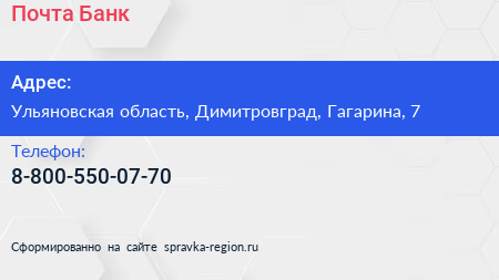 Почта Банк по адресу Ульяновская область, Димитровград, Гагарина, 7 в дальнейшем Организация, размещена в следующих категориях: