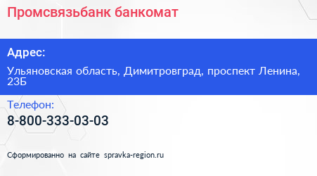 Промсвязьбанк, банкомат по адресу Ульяновская область, Димитровград, проспект Ленина, 23Б в дальнейшем Организация, размещена в следующих категориях: