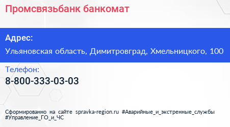 Промсвязьбанк, банкомат по адресу Ульяновская область, Димитровград, Хмельницкого, 100 в дальнейшем Организация, размещена в следующих категориях: