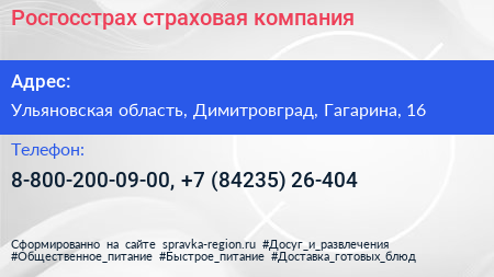 Росгосстрах, страховая компания по адресу Ульяновская область, Димитровград, Гагарина, 16 в дальнейшем Организация, размещена в следующих категориях: