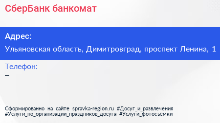 СберБанк, банкомат по адресу Ульяновская область, Димитровград, проспект Ленина, 1 в дальнейшем Организация, размещена в следующих категориях:
