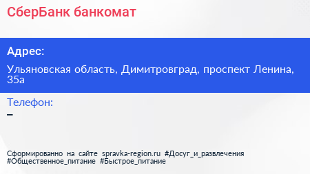 СберБанк, банкомат по адресу Ульяновская область, Димитровград, проспект Ленина, 35а в дальнейшем Организация, размещена в следующих категориях: