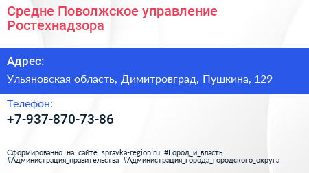 Средне-Поволжское управление Ростехнадзора по адресу Ульяновская область, Димитровград, Пушкина, 129 в дальнейшем Организация, размещена в следующих категориях: